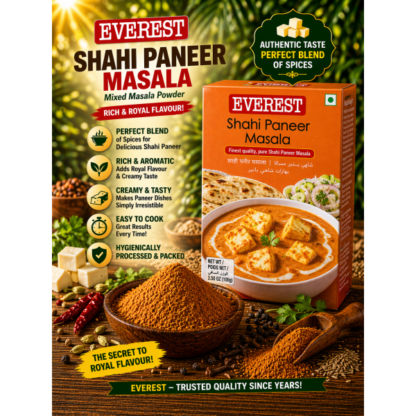 Everest Shahi Paneer Masala 100g is a premium spice blend specially crafted to prepare rich and creamy Mughlai-style paneer dishes. Made from a balanced mix of high-quality spices, it delivers a luxurious aroma, mild sweetness, and a smooth, flavorful taste.
