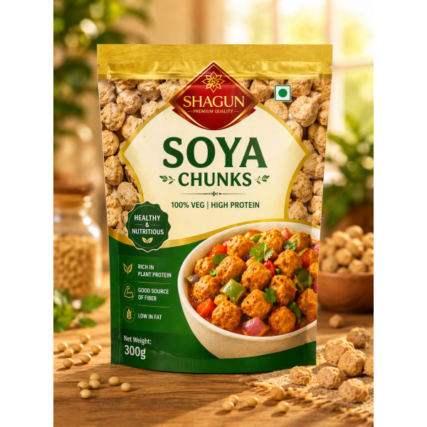 Shagun Soya Chunks 300g are premium quality, protein-rich nuggets made from defatted soy flour, offering a healthy and nutritious alternative to meat. Known for their excellent texture and ability to absorb flavors, soya chunks are a popular choice for vegetarian meals.