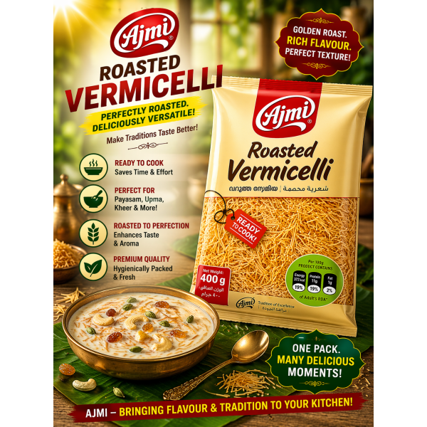 AJMI Roasted Vermicelli 400g is a premium quality pre-roasted seviyan made from carefully selected wheat, offering convenience and great taste in every dish. Being pre-roasted, it saves preparation time and ensures even cooking with perfect texture.